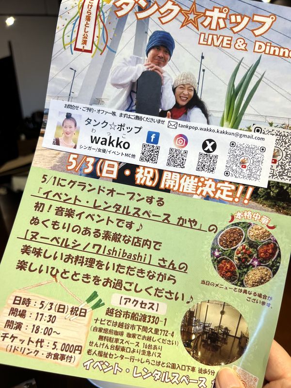 「イベント・レンタルスペースかや」のグランドオープンは、2026年5月1日。こけらおとしとして、5月3日(日)に、越谷が誇る元気楽天ユニット・タンク☆ポップの wakko(わっこ)さんとかっくん(kakkun)によるディナーショーが行なわれます(要予約)