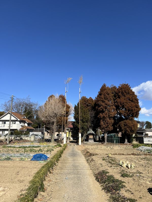 神社の前は畑地になっていて、畑と畑の間の小道をまっすぐ進んだ先、こんもりとした木立の中が、大杉稲荷神社。
