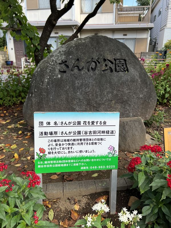 谷古田河畔緑道は「さんが公園」とも呼ばれている。また、谷古田河畔緑道の横を通っている市道90369号線の愛称は「さんがさくら通り」。「さんが」とは何か。