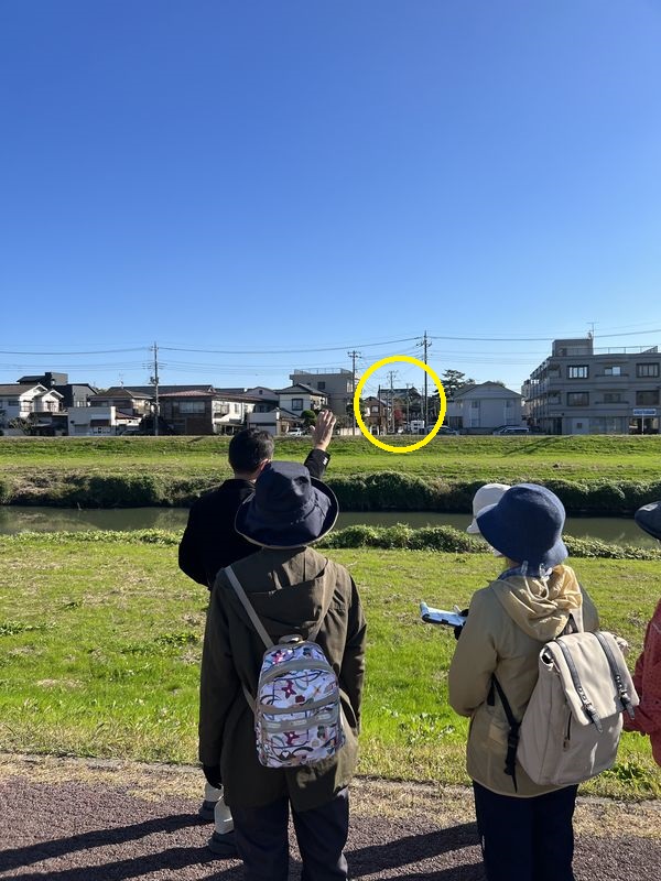 対岸に小さく越ヶ谷御殿跡碑が見える。逆川は、越ヶ谷御殿跡碑(上の写真の黄色い○印)のうしろにある伏越の吐き口から流下していく。