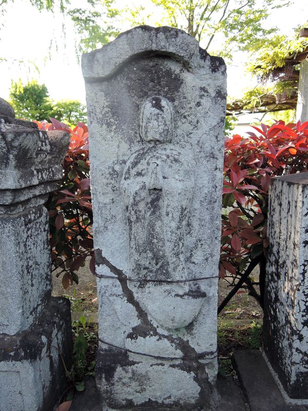 真ん中の石塔は地蔵菩薩像付き念仏供養塔。江戸中期・宝暦8年(1758)造立。正面に合掌型の地蔵菩薩立像が陽刻されている。石像全体に白いカビのように見えるウメノキゴケが付着しているので銘文は読み取りにくいが、「奉造立念佛同行三十二人信心」「施主」「敬白」「宝暦八□□天正月吉日」とある。宝暦8年の干支は「戊寅」(つちのえとら)なので、「宝暦八□□天正月吉日」の「□□」は「戊寅」と刻まれていると思われる。